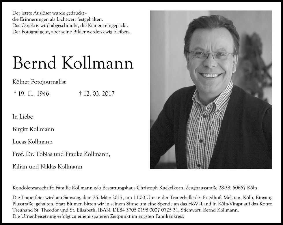 Bernd Kollmann (Kölner Fotojournalist), † 12.03.2017